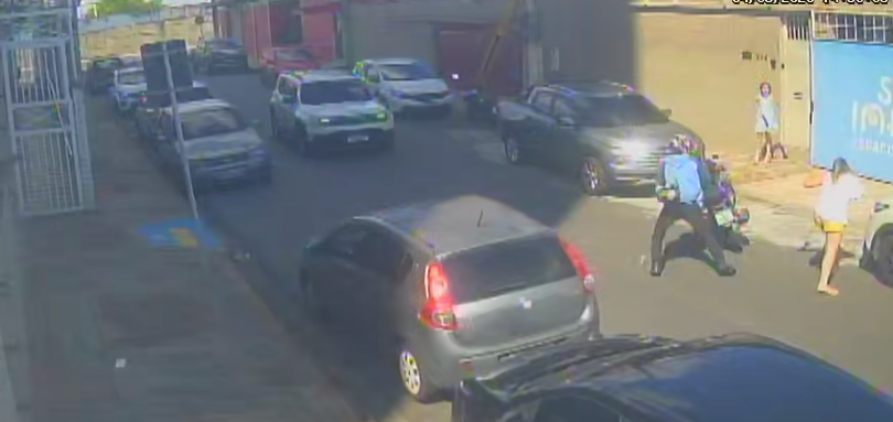Nas imagens, é possível ver a mulher caminhando pela via acompanhada de uma menina. Ao chegar em frente à própria casa e abrir o portão, ela é surpreendida por um motociclista, que anuncia o assalto utilizando uma arma falsa. O suspeito ameaça a vítima, quebra três dentes dela ao batê-la com um capacete e leva seus pertences. Em seguida, ele sobe na motocicleta e foge do local.