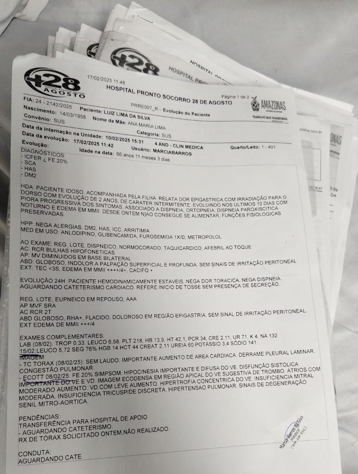 MANAUS (AM) – Após um desabafo nas redes sociais, a assistente administrativo Luana da Silva conversou com o Portal RIOS DE NOTÍCIAS para denunciar que o pai, um idoso de 66 anos, identificado como Luiz Lima da Silva, está há mais de 10 dias internado no Hospital e Pronto-Socorro 28 de Agosto, onde aguarda para realizar um cateterismo cardíaco no Hospital Francisca Mendes, na zona Norte de Manaus.