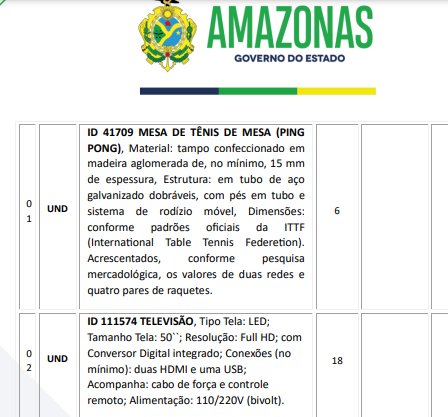 Sem valores previamente informados, a lista reúne 13 itens a serem adquiridos, dentre eles estão 18 videogames, 18 poltronas massageadoras, 6 mesas para prática de tênis de mesa, 6 maca/mesa de massagem, 96 puff’s, 18 cafeteiras expresso, além de cadeiras e outros itens.