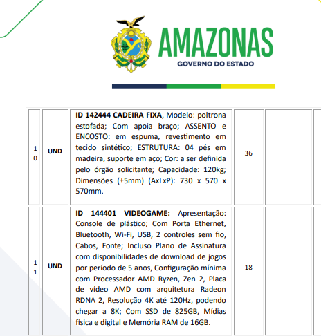 MANAUS (AM) – A realização de um pregão eletrônico para aquisição de mobiliários e equipamentos pela Secretaria de Estado de Segurança Pública do Amazonas (SSP-AM) gerou polêmica na manhã desta segunda-feira, 30/10. Entre os itens a serem adquiridos estão: videogames, televisões, cadeiras, massageadoras, mesas para prática de tênis de mesa, entre outros. Data para acontecer no dia 7 de novembro, o pregão gerou polêmica entre os internautas.