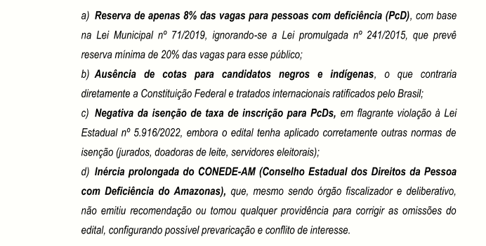 Entre as irregularidades, está a reserva de apenas 8% das vagas para pessoas com deficiência, sendo que a lei estadual exige pelo menos 20%. Também não há vagas reservadas para negros e indígenas, o que fere diretamente a Constituição.