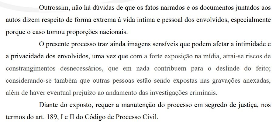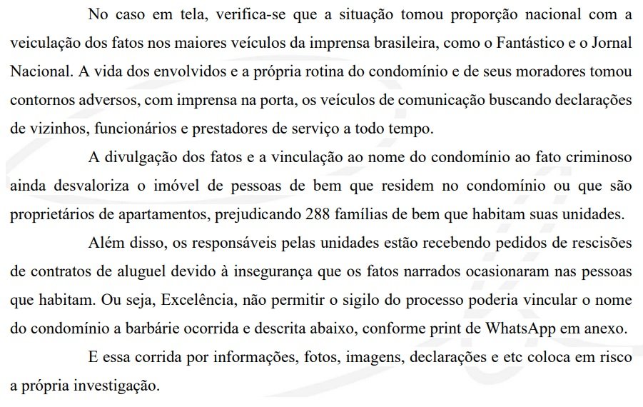 O condomínio argumenta que a situação tomou proporção nacional após a veiculação dos fatos no Fantástico, da TV Globo, e tem causado constrangimentos, prejudicando a rotina dos moradores e desvalorizando as propriedades. Além disso, o documento alega que a exposição pública pode comprometer a investigação.