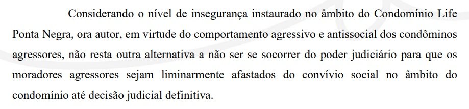 O condomínio também alega que a presença de Raimundo Nonato e Jussana representa um risco para os moradores, dado o histórico de agressões e a natureza violenta do crime. A situação é agravada pelo fato de que os réus são proprietários de unidades no condomínio e podem ser soltos a qualquer momento.