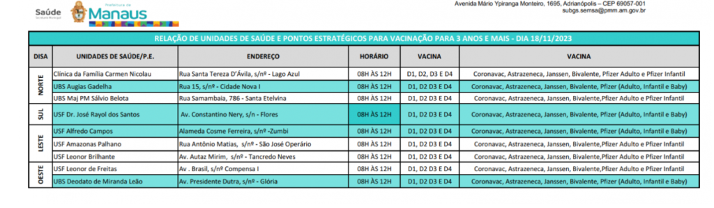 MANAUS (AM) – Dando continuidade à vacinação contra a Covid-19, Manaus disponibiliza o imunizante em 74 unidades da Secretaria Municipal de Saúde (Semsa) no período de terça-feira a sexta-feira, 21 a 24/11, respectivamente. A população pode buscar os endereços e os horários de funcionamento das unidades no link bit.ly/localvacinacovid19.