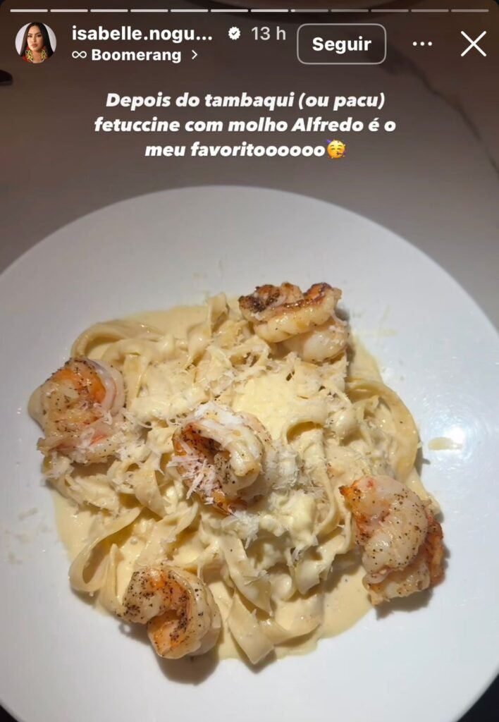 Isabelle mostrou um pouco da culinária local em seus stories, revelando seus pratos favoritos: “Depois do tambaqui (ou pacu), fettuccine com molho Alfredo é o meu favorito”, comentou.
