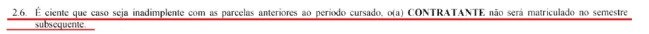 Além disso, o contrato firmado entre o aluno e a instituição reforça a regra. Cláusulas anexadas ao processo indicam que o estudante “não será matriculado no semestre subsequente” caso haja débitos pendentes, além de garantir à faculdade o direito de recusar a rematrícula de inadimplentes.
