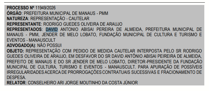 O pedido foi protocolado pelo vereador Rodrigo Guedes (Progressistas) e envolve o prefeito David Almeida (Avante) e o diretor-presidente da Manauscult, Jender Lobato.