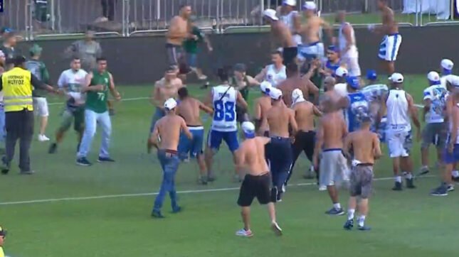 A confusão começou após o gol marcado por Robson, aos 45 minutos do segundo tempo, quando um grupo de cruzeirenses invadiu o gramado na parte de trás do gol. Do outro lado, a torcida da casa também pulou o alambrado e foi para o confronto.
