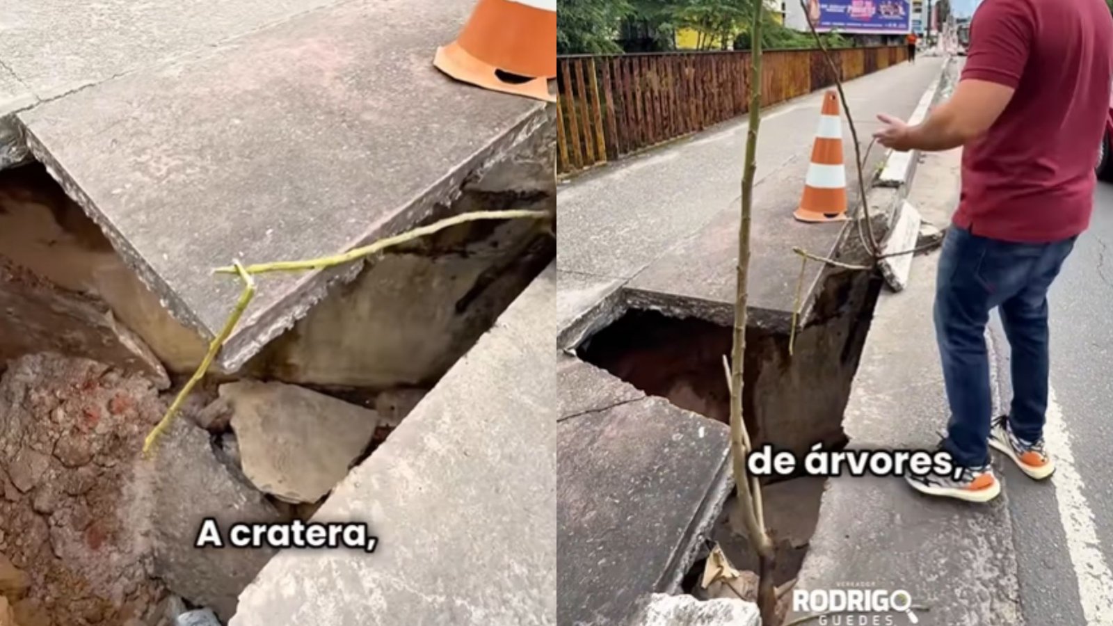 Após a abertura da cratera, os próprios moradores e comerciantes colocaram cones e pedaços de madeira para sinalizar o trecho e evitar acidentes. O vereador também questiona a gestão municipal sobre as ações para o conserto da área.