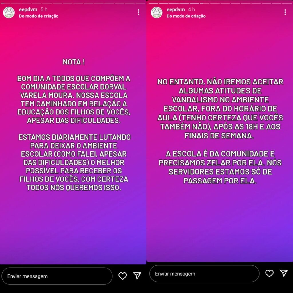 A escola repudiou o ato dos bandidos, destacando que “atitudes como essa não podem ser aceitas”.