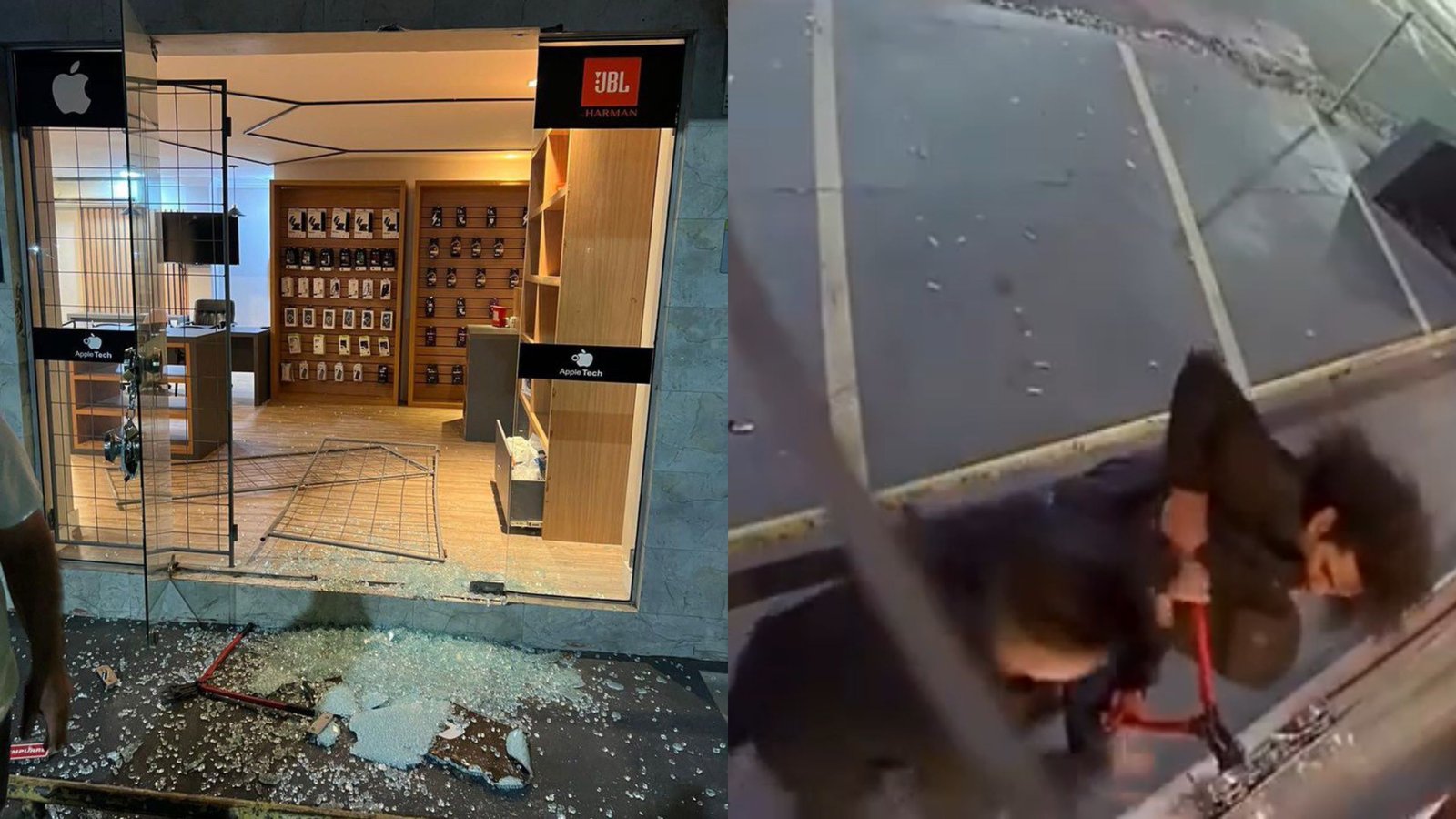 Os dois criminosos, de cara limpa, chegaram em uma motocicleta vermelha por volta das 02h50 desta madrugada. Invadiram a loja Apple Tech, quebrando a porta de vidro da frente do estabelecimento e, com o auxílio de um alicate, cortaram os cadeados e entraram no local.