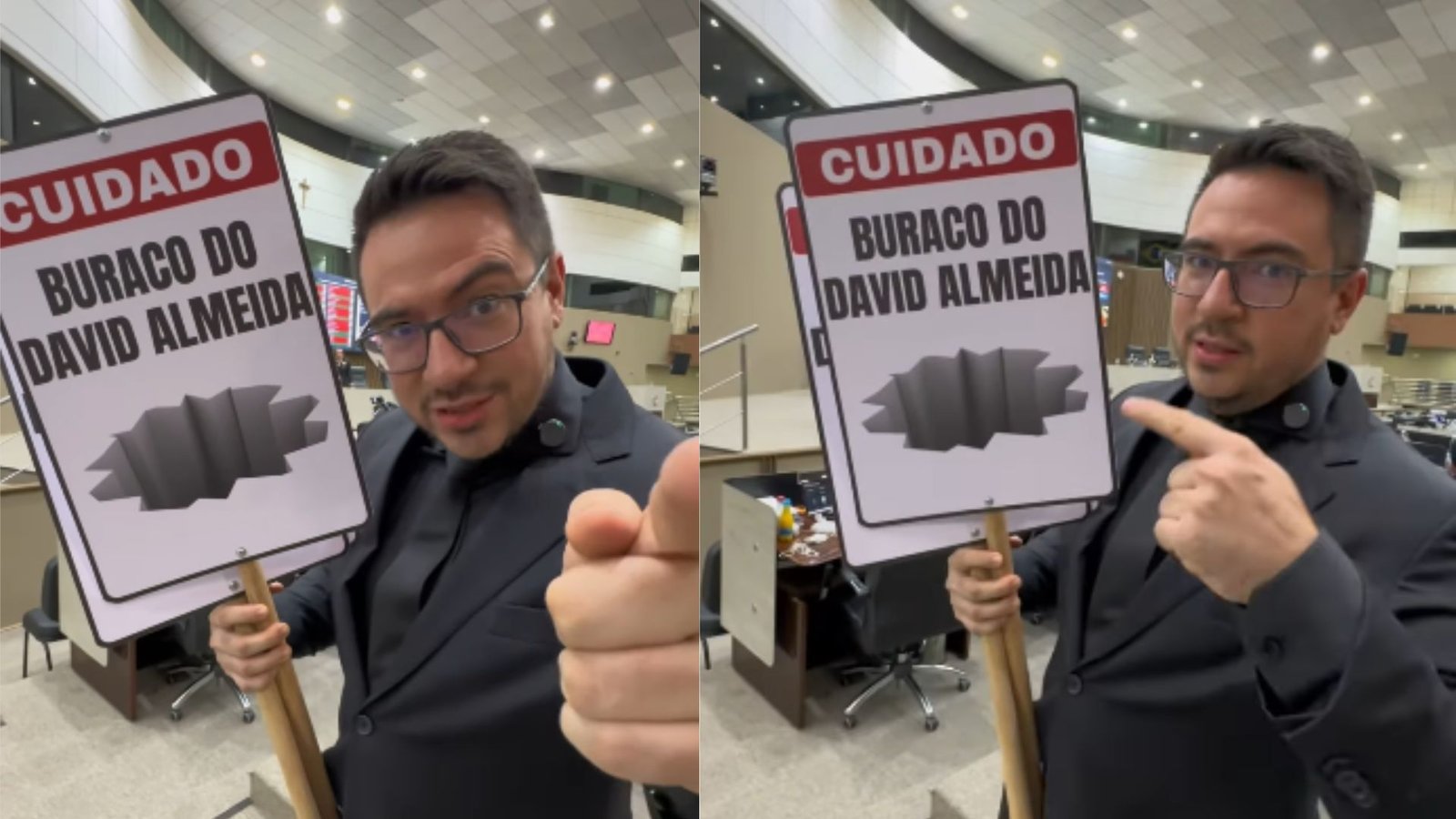 “Chegaram as primeiras plaquinhas de sinalização dos buracos da cidade de Manaus: ‘Buraco do David Almeida e do Renato Júnior’. A gente vai colocar o pau no buraco de vocês. Vamos sinalizar porque a população está perdendo seus bens”, declarou o parlamentar em vídeo publicado nas redes sociais.
