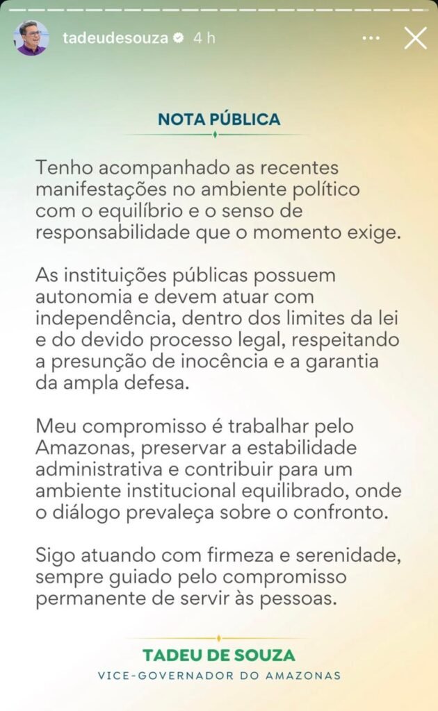 O vice-governador Tadeu de Souza (PP), publicou uma nota em suas redes sociais afirmando que acompanha atentamente as manifestações e posicionamentos do prefeito de Manaus, David Almeida (Avante).