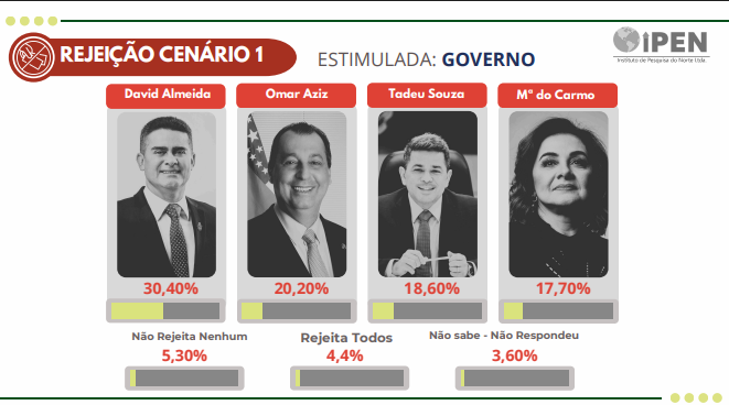 David Almeida lidera o ranking, com 30,40% de rejeição, resultado associado ao desgaste da atual gestão municipal. Já Omar Aziz aparece em seguida, com 20,20%, carga negativa atribuída ao longo histórico político do senador.