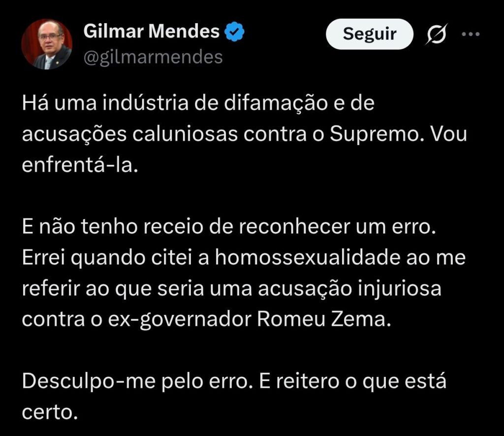 “Há uma indústria de difamação e de acusações caluniosas contra o Supremo. Vou enfrentá-la. E não tenho receio de reconhecer um erro. Errei quando citei a homossexualidade ao me referir ao que seria uma acusação injuriosa contra o ex-governador Romeu Zema. Desculpo-me pelo erro. E reitero o que está certo”, escreveu o ministro em seu perfil na rede social X.
