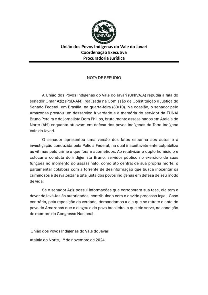 MANAUS (AM) – A União dos Povos Indígenas do Vale do Javari (Univaja), por meio de nota, repudiou nesta sexta-feira, 1º/11, a fala do senador Omar Aziz (PSD-AM) realizada na última quarta-feira, 30/10, na Comissão de Constituição de Justiça do Senado Federal (CCJ).