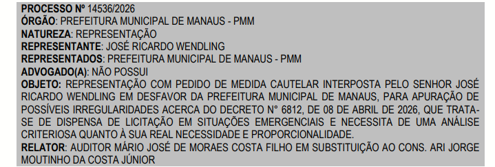 MANAUS (AM) – O Tribunal de Contas do Estado do Amazonas admitiu uma representação que questiona possíveis irregularidades em decreto da Prefeitura de Manaus que permite a dispensa de licitação em situações emergenciais. A medida foi publicada no dia 8 de abril.