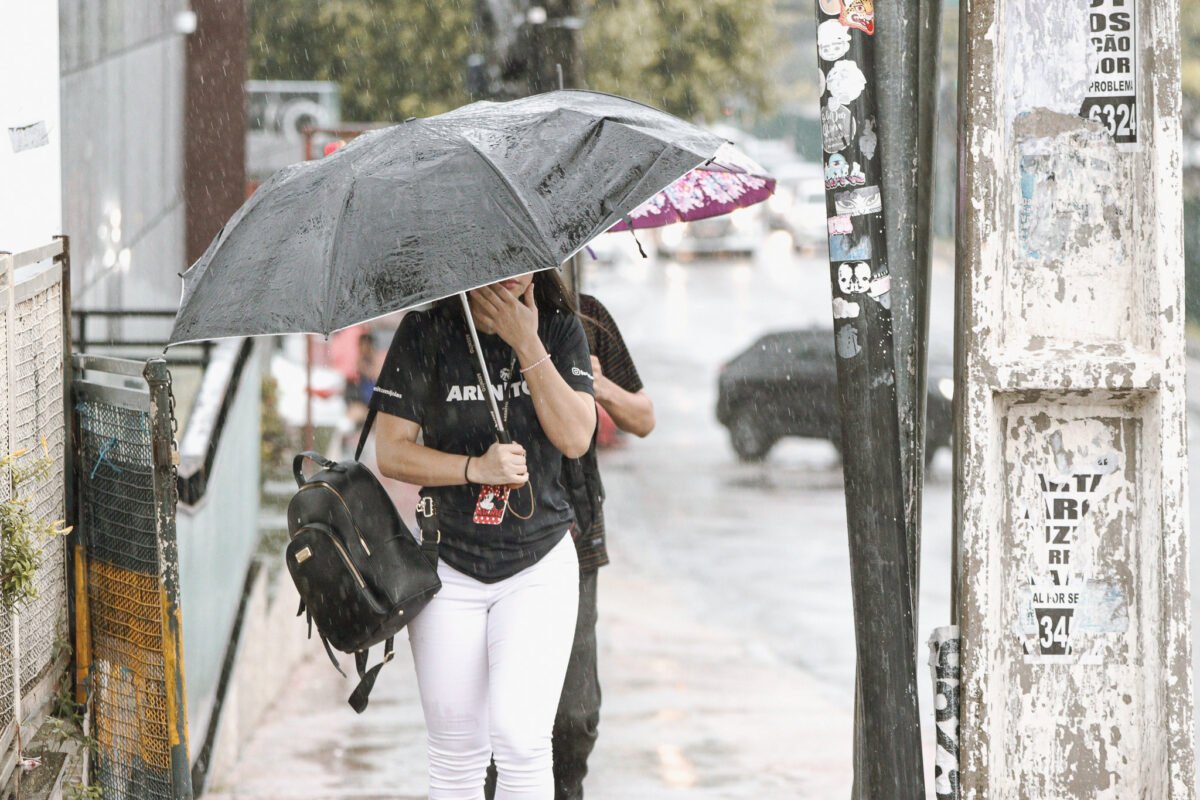 O alerta aponta perigo potencial, com ventos entre 30 e 60 km/h e volume de chuva entre 50 e 100 mm/dia. Os riscos incluem corte de energia elétrica, queda de galhos, alagamentos e descargas elétricas.