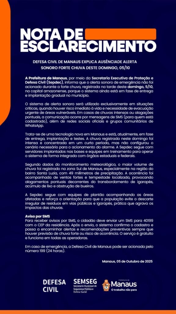 Em resposta, a Defesa Civil de Manaus afirmou que o sistema ainda está em fase de implantação e que só será acionado em casos considerados críticos, como riscos diretos à vida e necessidade imediata de evacuação.
