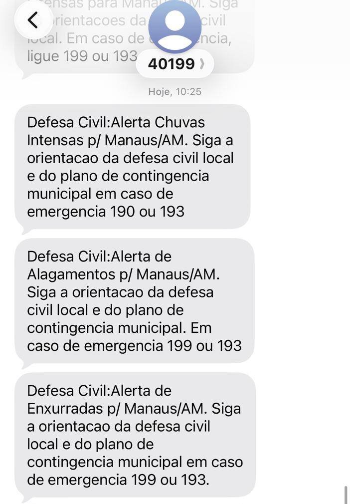 Em mensagem enviada por SMS aos moradores da capital, a Defesa Civil orientou a população a seguir o plano de contingência municipal e, em caso de emergência, acionar os números 199 ou 193.