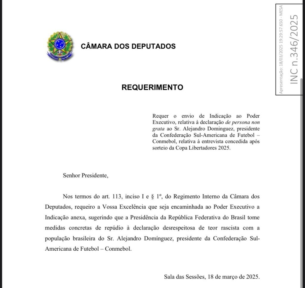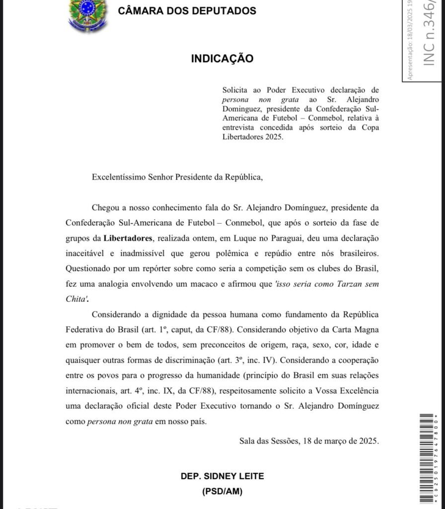 MANAUS (AM) – Uma indicação para que o presidente da Conmebol, Alejandro Dominguez, seja considerado “Persona Non Grata” no Brasil , foi enviada pelo deputado federal amazonense Sidney Leite (PSD) ao Governo Federal.
