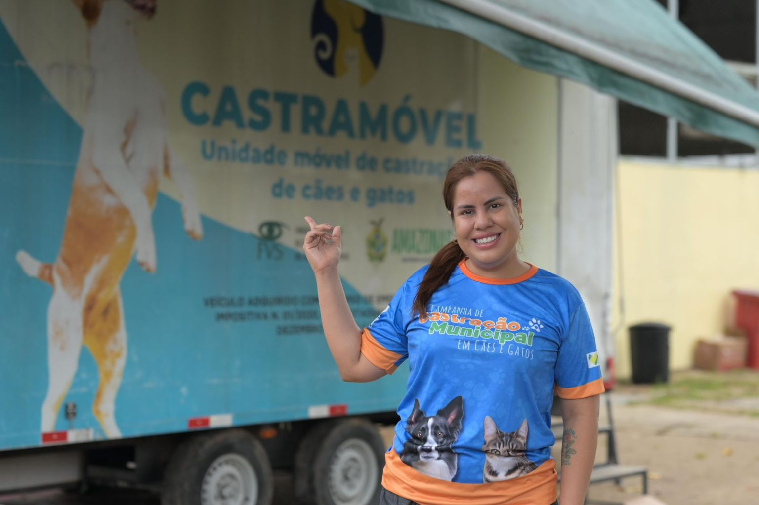 Secretária da Sepet, Leda Mara, em frente ao carro do Castramóvel, um dos principais projetos desenvolvidos pela pasta, durante ação realizada no município de Barcelos - (Foto: Reprodução/Sepet)