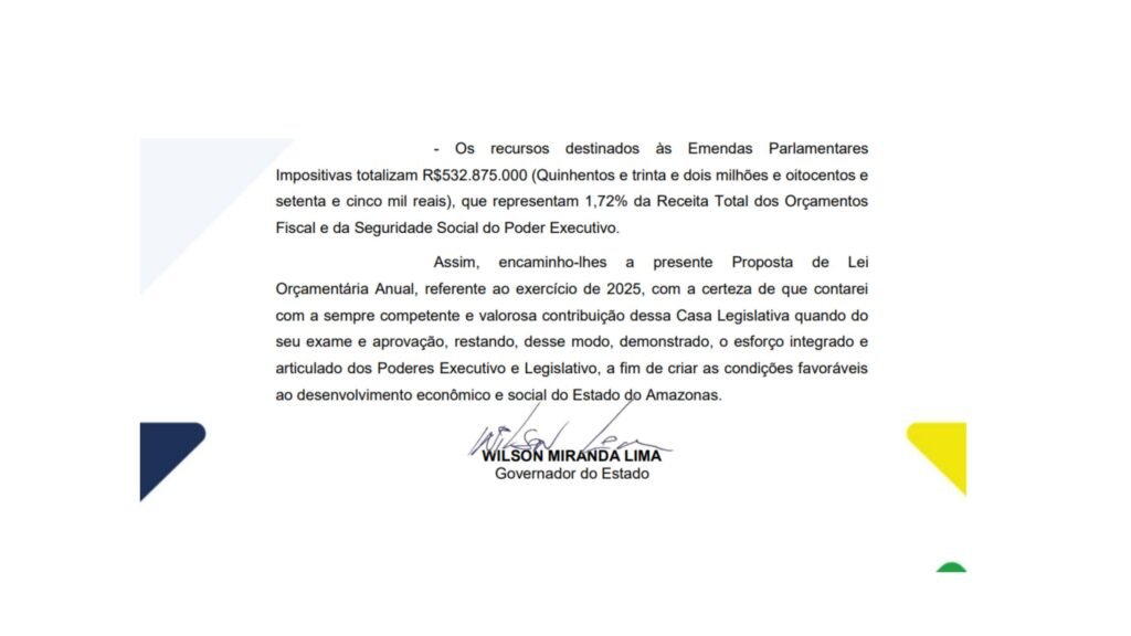 MANAUS (AM) – O governo de Wilson Lima (União) enviou recentemente à Assembleia Legislativa do Amazonas (Aleam) a proposta da Lei Orçamentária Anual (LOA) para 2025, que prevê um orçamento total estimado em R$ 31,4 bilhões, ligeiramente maior que os R$ 30,1 bilhões do ano anterior.
