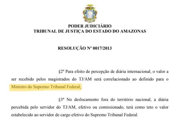 A Resolução 017/2023 do TJAM estipula que as diárias dos magistrados sigam os mesmos valores do Supremo Tribunal Federal. Para viagens dentro do Amazonas, o valor é de R$880,17; para viagens nacionais, R$1.466,95; e para viagens internacionais, o valor é pago em dólar, sendo US$ 959,40, equivalente a R$4.957,32 na cotação atual de R$5,17.