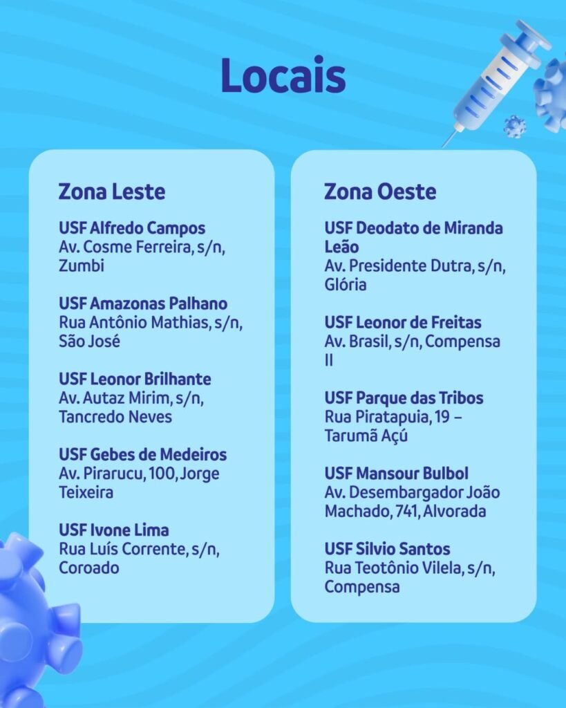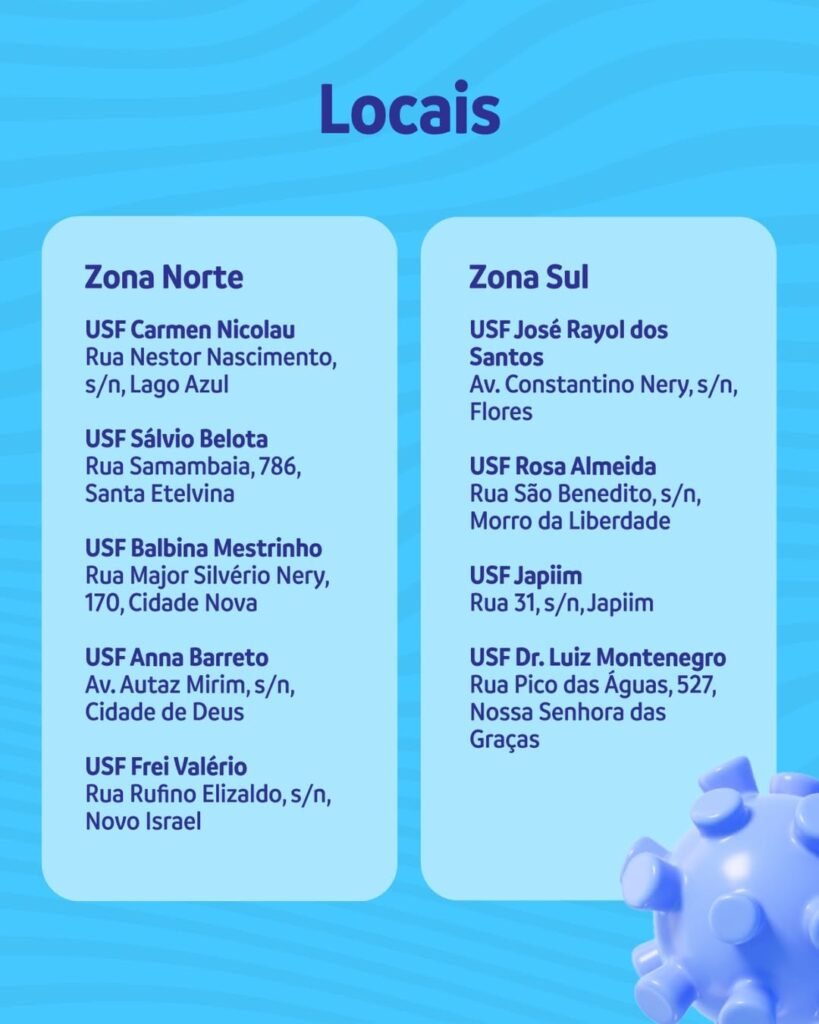 MANAUS (AM) – Acontece neste sábado, 29/11, a campanha nacional de vacinação contra a Influenza (gripe) e o Dia D do Novembro Azul. A ação será realizada na Unidade de Saúde da Família (USF) Leonor de Freitas, e em outras 18 unidades, distribuídas por diversas zonas de Manaus.