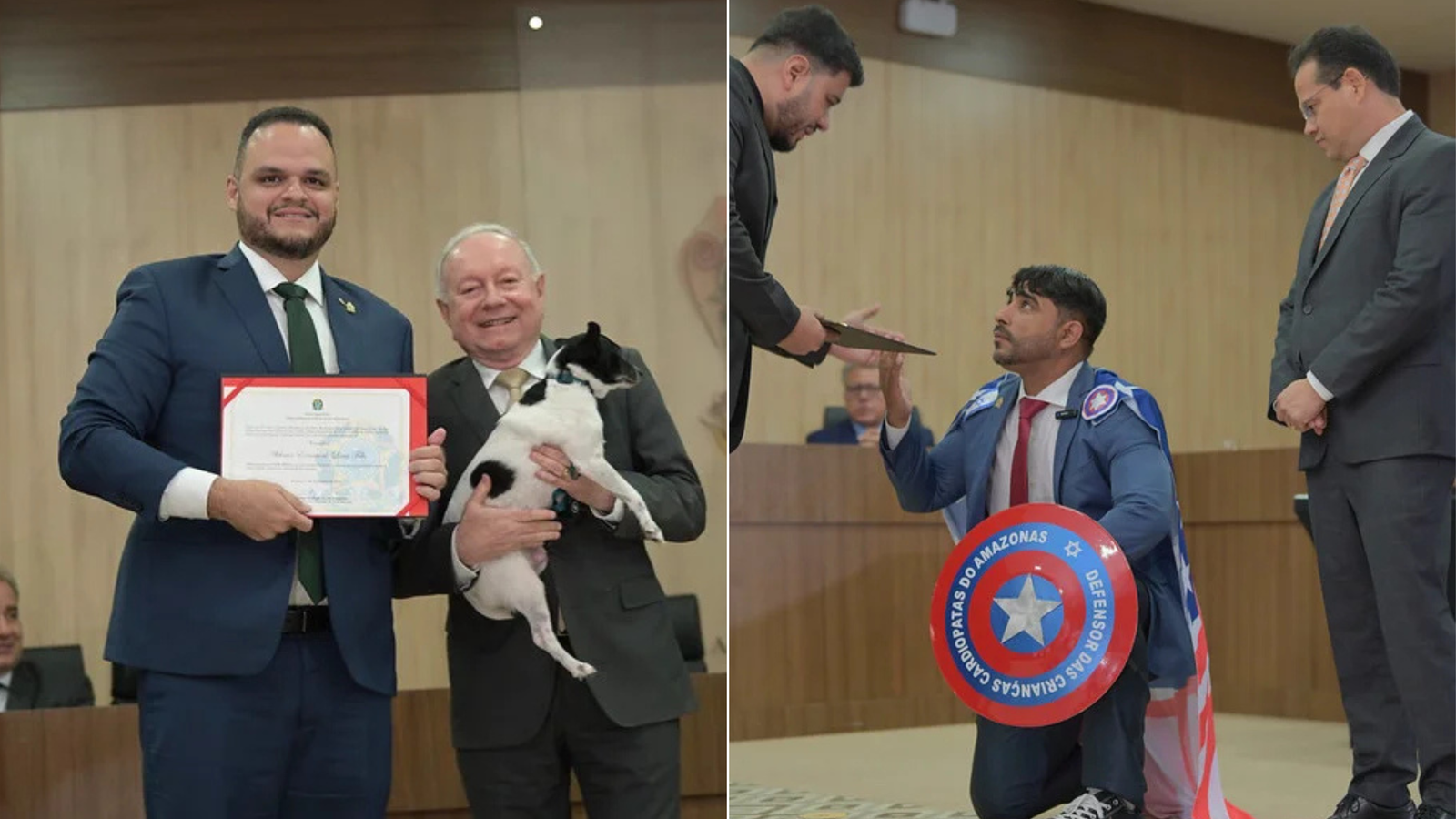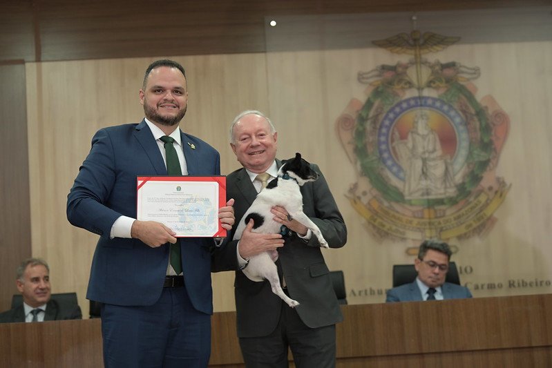 Outra figura que chamou atenção foi o vereador eleito Aldenor Lima (União), que levou seu mascote Totó para a cerimônia. Nas redes sociais, Aldenor explicou que Totó foi seu primeiro paciente como cirurgião veterinário e teve duas patas amputadas após um acidente com roçadeira. O gesto tocou o presidente do TRE-AM, desembargador João Simões, que acariciou e chegou a segurar o cachorro no colo.