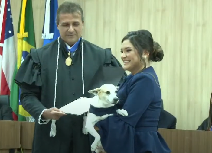 Aldenor seguiu os passos da esposa, a deputada estadual Joana Darc (União), que em 2018 também foi diplomada com sua pet de estimação, Tânia, nos braços e repetiu a ação em 2022 quando reeleita.
