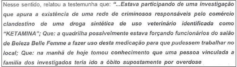Em seu depoimento, ele ainda afirmou que a quadrilha possivelmente forçava funcionários dos salões Belle Femme a usar a droga para trabalhar.