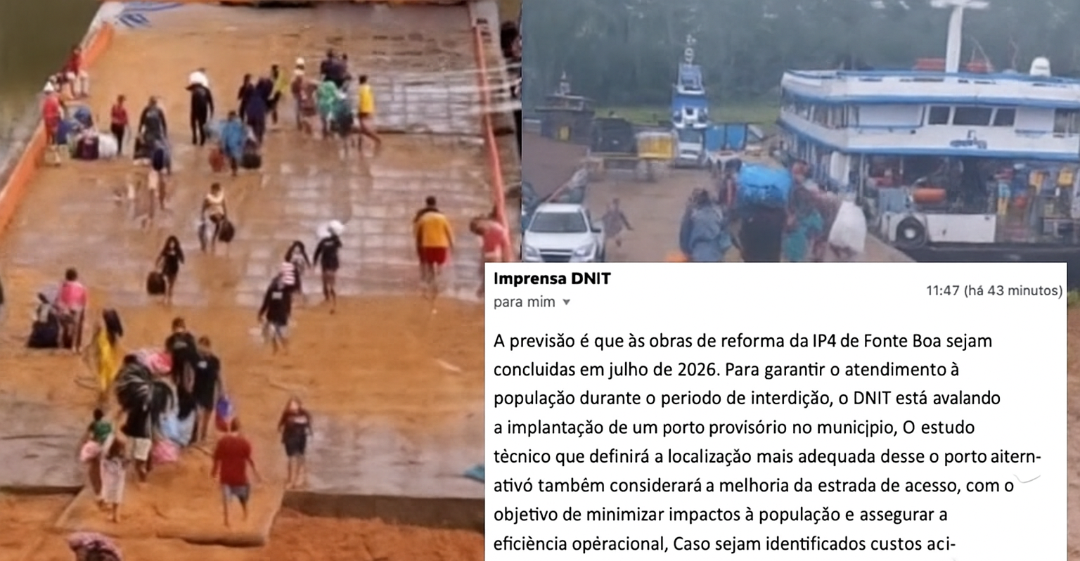 “A previsão é que as obras de reforma da IP4 de Fonte Boa sejam concluídas em julho de 2026. Para garantir o atendimento à população durante o período de interdição, o Dnit está avaliando a implantação de um porto provisório no município. O estudo técnico que definirá a localização mais adequada desse porto alternativo também considerará a melhoria da estrada de acesso, com o objetivo de minimizar impactos à população e assegurar a eficiência operacional. Caso sejam identificados custos adicionais, estes serão devidamente absorvidos no processo”.