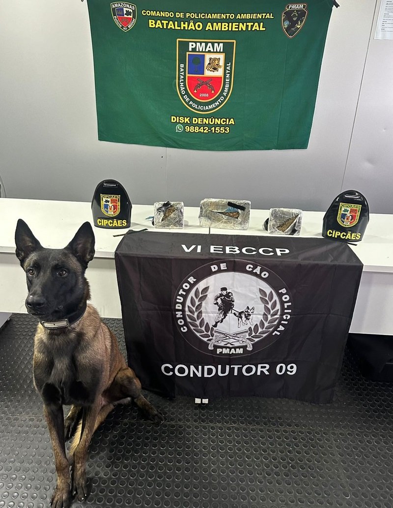 O cão policial de faro para narcóticos, Xerife, da Companhia Independente de Policiamento com Cães (CIPCães) deu apoio as duas fiscalizações. No total foram apreendidos oito tabletes de entorpecentes pesando aproximadamente 12,1 kg.