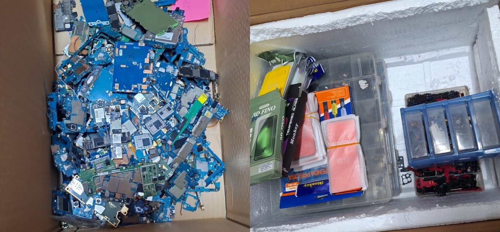 As equipes foram ao local e localizaram o suspeito denunciado. O homem foi encontrado na companhia de outro homem, que também foi detido. Na banca, os policiais encontraram diversas peças entre frontal, carcaças, câmeras, cabo flet, bateria, gaveteiro com leitor biométrico, películas, centenas de bandeja de chip e um notebook com programas de desbloqueio de celulares.