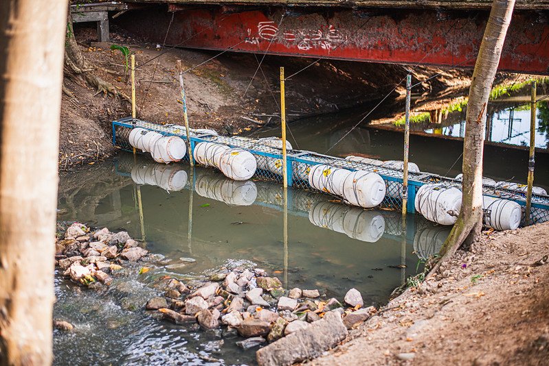 A estrutura flutuante foi criada para conter o fluxo de lixo, agindo como um filtro dos poluentes presentes nas águas, impedindo a passagem dos resíduos sólidos.
