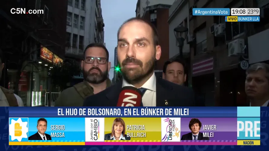 A entrevista do parlamentar foi concedida ao canal em frente ao “bunker” da campanha de Milei, no Hotel Liberdade, em Buenos Aires. O C5N é um dos canais de TV mais importantes da Argentina.