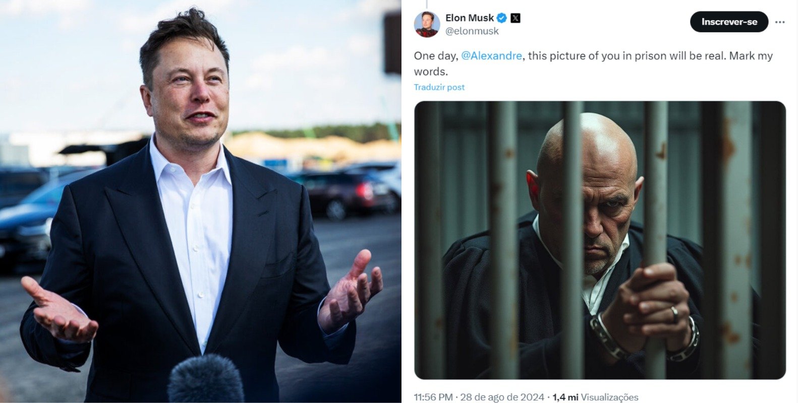 Em outra publicação utilizando uma imagem criada por IA, Musk afirma que a foto de Moraes na prisão será real: “marque minhas palavras”.