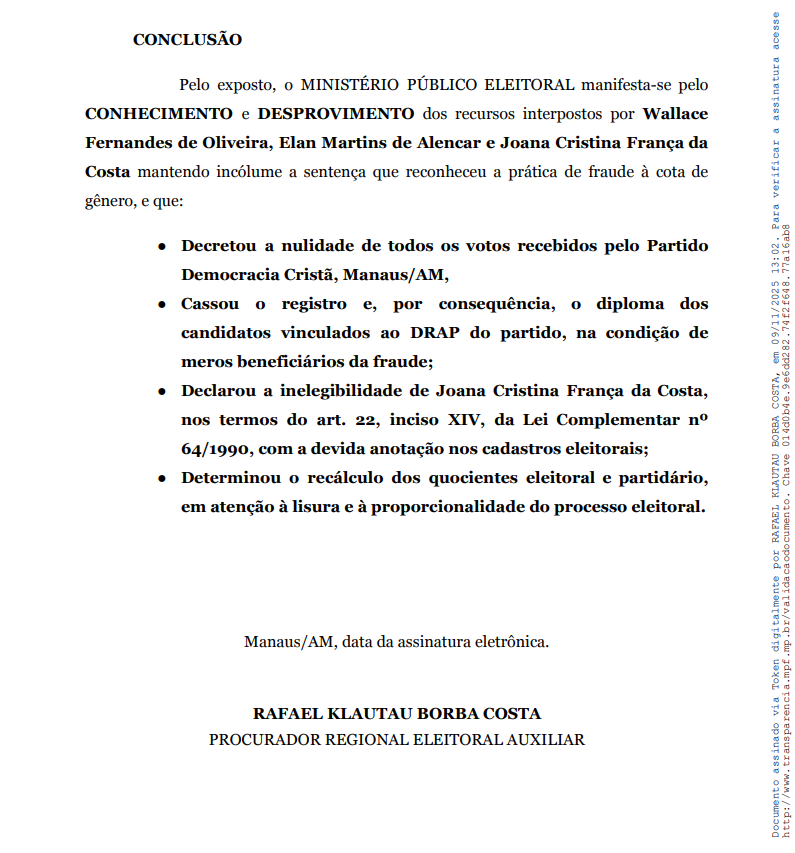O parecer foi assinado pelo procurador regional Rafael Klautau Borba, que determinou a nulidade dos registros e diplomas de todos os candidatos vinculados ao Demonstrativo de Regularidade de Atos Partidários (DRAP) da legenda.