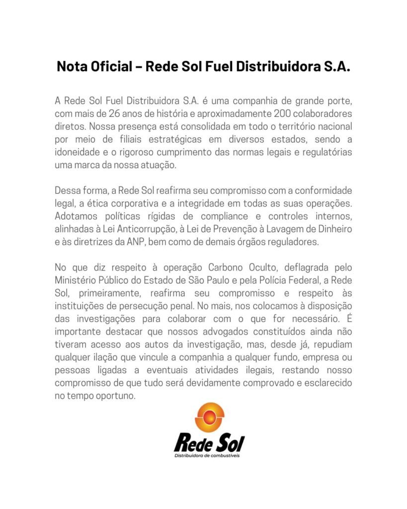 Em nota, a Rede Sol Fuel afirmou que adota rigorosas políticas de compliance e controles internos, alinhadas à Lei Anticorrupção, à Lei de Prevenção à Lavagem de Dinheiro e às diretrizes da Agência Nacional do Petróleo (ANP), bem como dos demais órgãos reguladores.