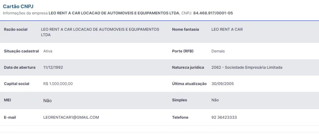 As transferências, totalizando R$ 100 mil, usaram o CNPJ da Rio Negro Motors, empresa do mesmo proprietário da locadora, Leonel Rodrigues do Couto Filho. As duas empresas compartilham o mesmo endereço, localizado na Avenida Tancredo Neves, Parque 10, zona Centro-Sul de Manaus.