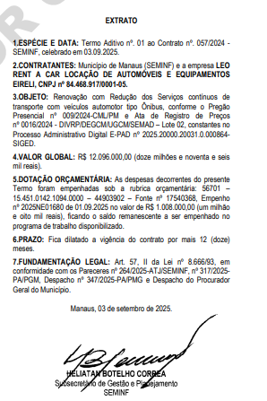 O contrato foi publicado no Diário Oficial do Município na última quinta-feira, 25/9, e prorroga por mais 12 meses a prestação do serviço, com vigência até setembro de 2026. Segundo o documento, os ônibus são utilizados pela administração municipal em atividades operacionais.