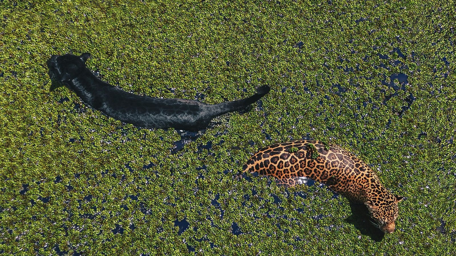 A onça-pintada chega a mergulhar totalmente, enquanto a onça-preta aguarda antes de seguir o movimento da companheira. A tranquilidade dos felinos em meio à mata acabou chamando atenção pela beleza e pela raridade do comportamento observado.