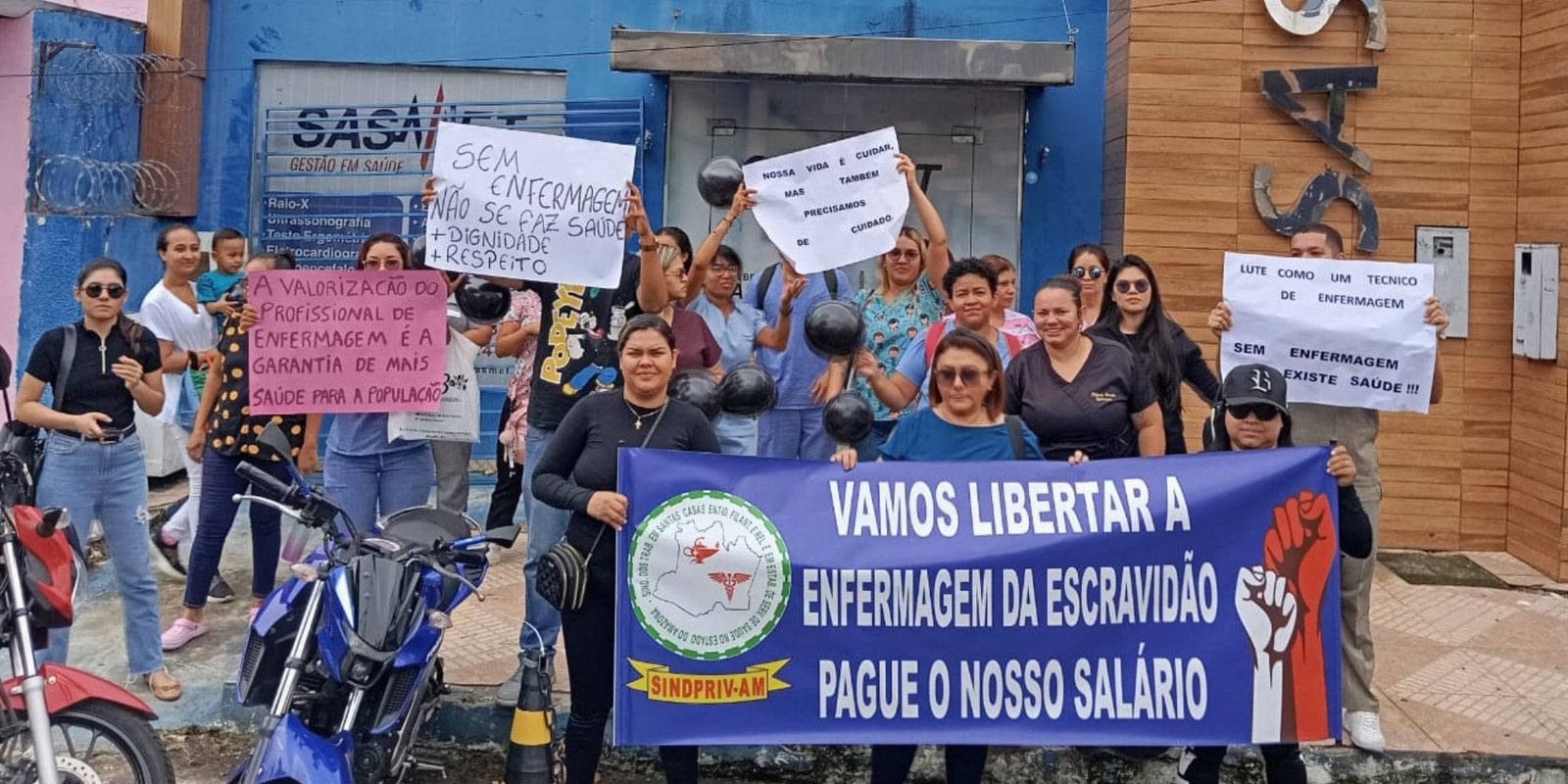 MANAUS (AM) – Enfermeiros que atuam em hospitais infantis públicos da capital amazonenses protestaram por seus direitos nesta sexta-feira, 2/2, em frente ao Grupo Sasmet, localizado na avenida Ayrão, zona Sul de Manaus. De acordo com a categoria, o ato surge como resposta ao encerramento de contratos, feito por mensagem de celular, além do atraso dos salários.