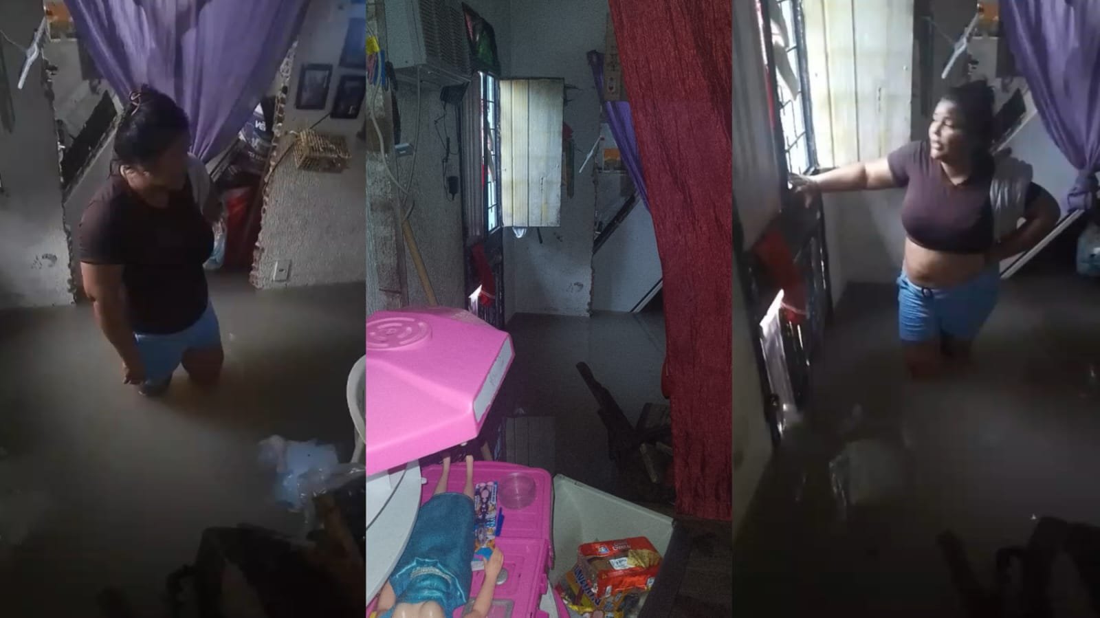 A água invadiu a residência, destruiu móveis e eletrodomésticos e deixou a família ilhada. Em vídeo divulgado nas redes sociais, a moradora criticou a gestão do prefeito David Almeida (Avante).