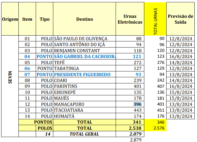 “A logística das urnas no Amazonas é realizada através de entrepostos chamados polos, localizados em municípios nos quais, após a chegada, é feito o processo de carga das urnas, que é a inserção das mídias com os dados dos candidatos e dos eleitores das respectivas seções de votação, com a imediata colocação do lacre, que é um adesivo em papel moeda, que vai assinado pelo juiz e pelo promotor titulares da Zona Eleitoral. Após isso, as urnas são levadas a outros municípios, em geral próximos aos polos, e, muitas vezes, ainda vão, via transporte fluvial ou aéreo, para seus locais de votação”, esclareceu o TRE.