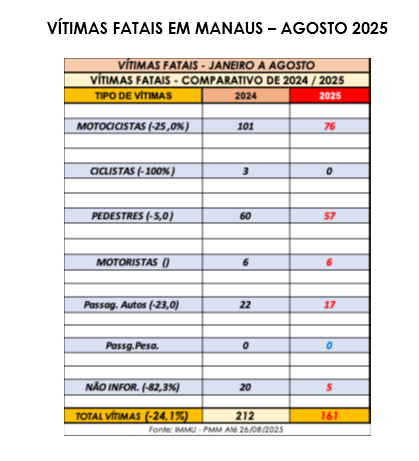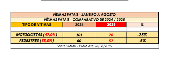 Apesar do alto número de infrações, os dados revelam melhora nos índices de violência viária. Entre janeiro e 1º de setembro, as mortes no trânsito caíram de 236 em 2024 para 167 em 2025, uma redução de 29%. Também houve queda nos atropelamentos (de 64 para 58) e nos óbitos de motociclistas (de 104 para 79). Os motociclistas, no entanto, seguem como o grupo mais vulnerável.