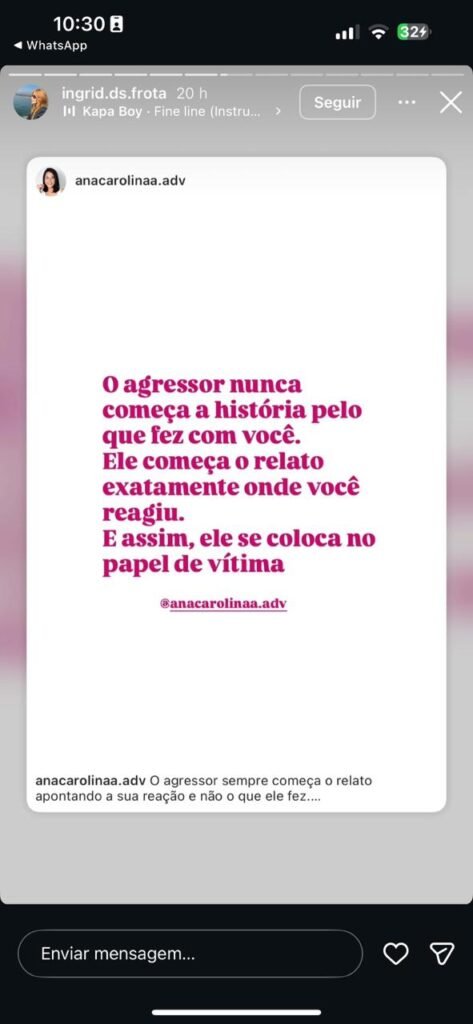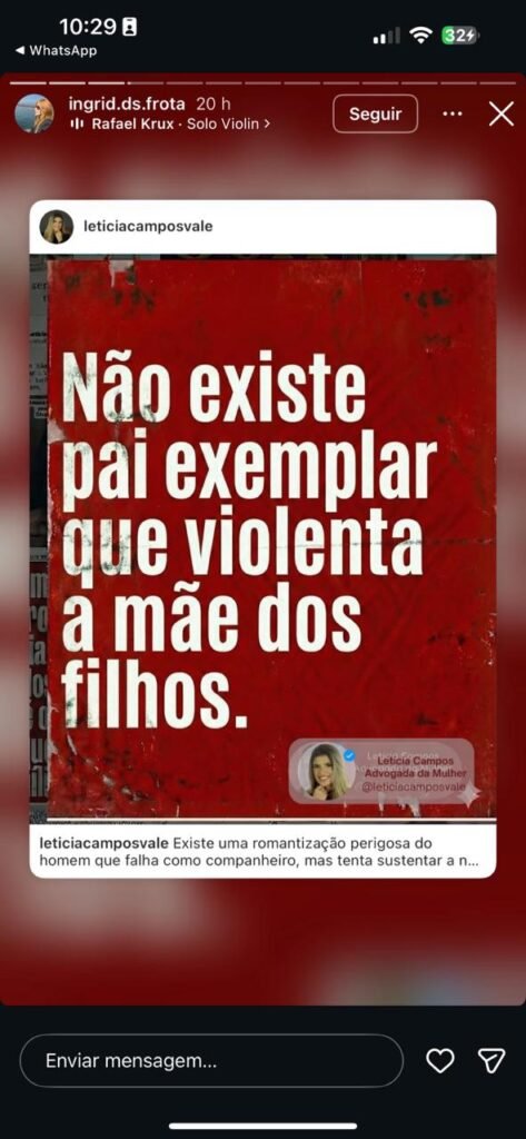 Antes do registro da ocorrência, Ingrid Frota publicou em suas redes sociais mensagens que remetem a situações de violência. Em uma das postagens, afirmou que “não existe pai exemplar que violenta a mãe dos filhos”.