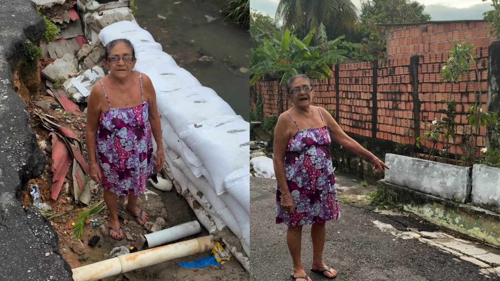 Ela também relata riscos enfrentados por quem vive na região e afirma que a obra teria sido deixada incompleta. “A prefeitura deixou pela metade, você quer vir terminar? A nossa rua está caindo, você quer vir ajeitar?”, diz.