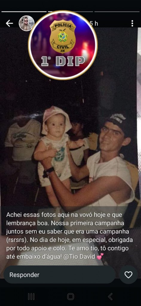 “A foto que a investigada publicou nas redes sociais como sendo ela criança carregada pelo prefeito, na verdade é uma imagem de David Almeida com sua filha Fernanda Aryel. Outra foto em que também publicou ao lado de David foi tirada por ela mesma em um local público, como é recorrente nas diversas vezes em que o prefeito é abordado por populares, que pedem para tirar fotos com ele.”